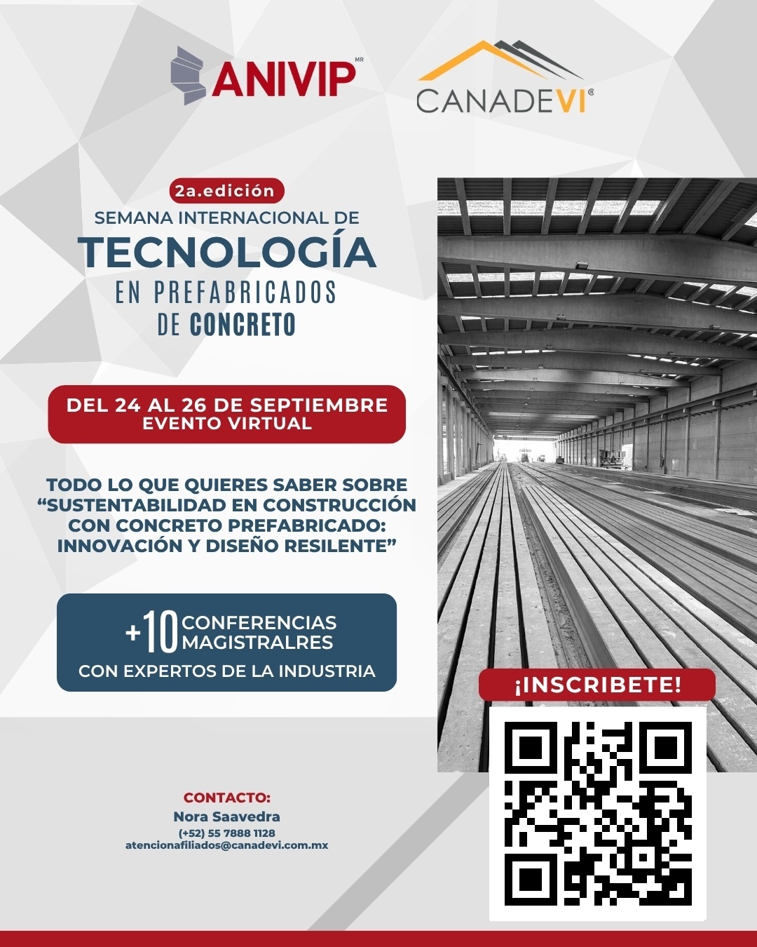 Del 24 al 26 de septiembre, participa en este evento virtual con más de 10 conferencias magistrales sobre sustentabilidad en construcción con concreto prefabricado, innovación y diseño resiliente.