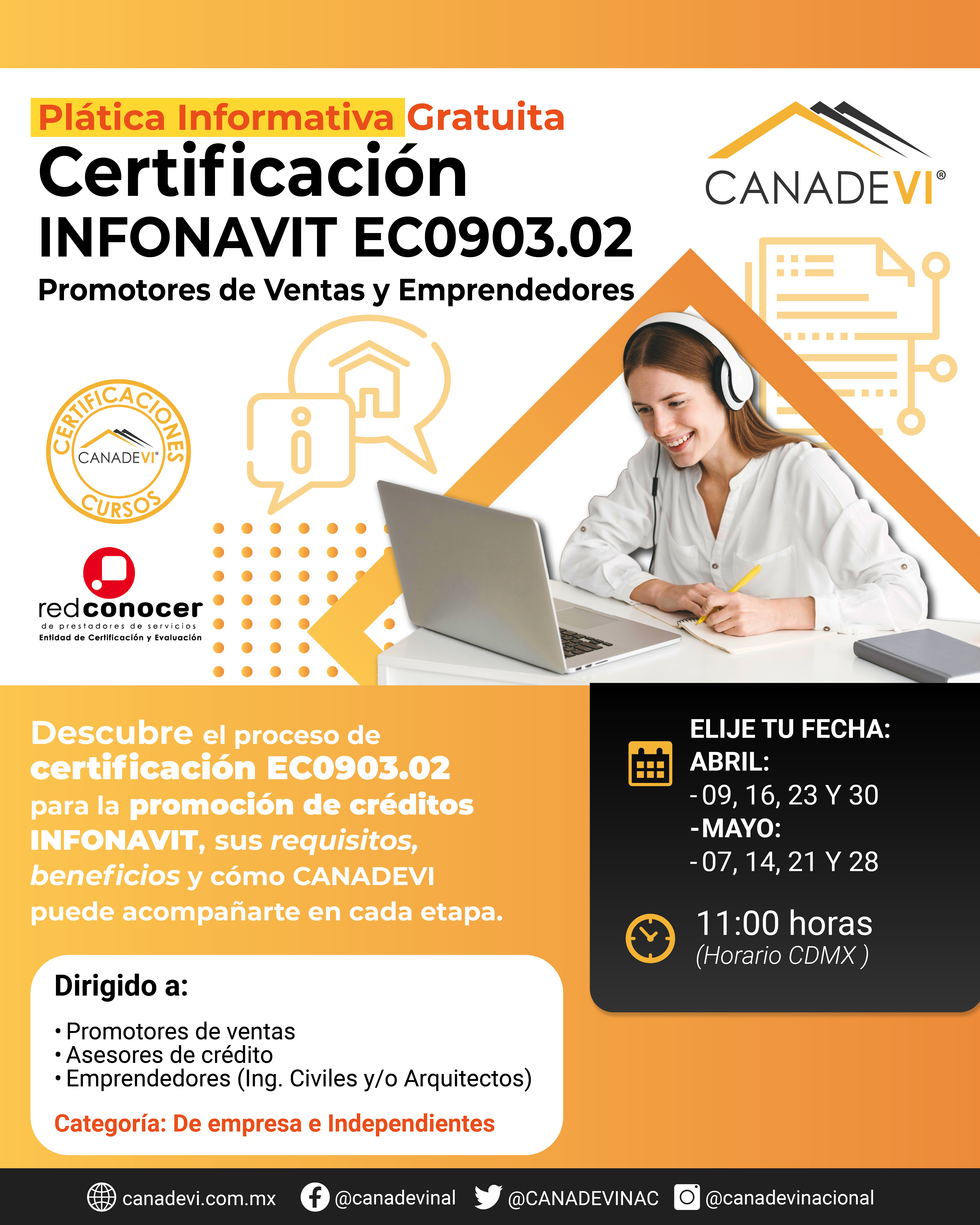 “plática sin costo”,CANADEVI te invita a la “plática sin costo”, para que conozcas la certificación EC0110.02 Asesoría enComercialización de Bienes…